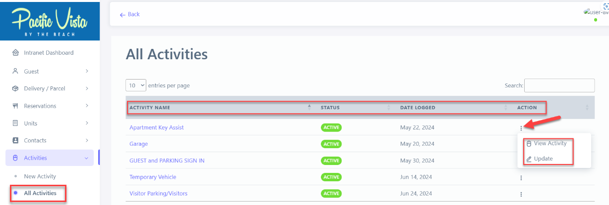 - All Activities - You can view all activity names, statuses, and logged dates. Additionally, you can also view and update activities as needed by clicking the three-dot icon under "Actions."