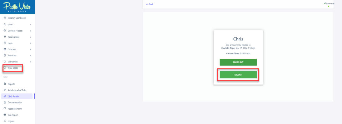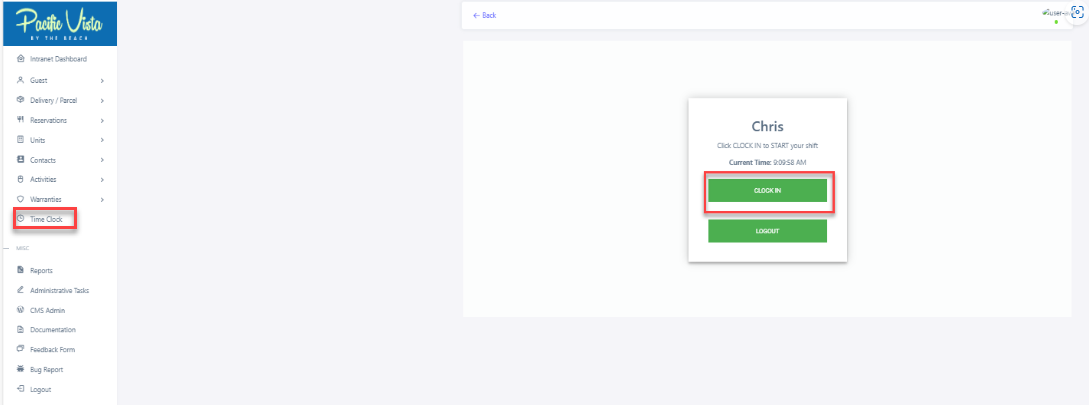To begin your work shift, navigate to the designated section and click "Clock In."